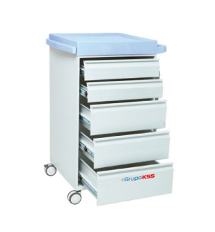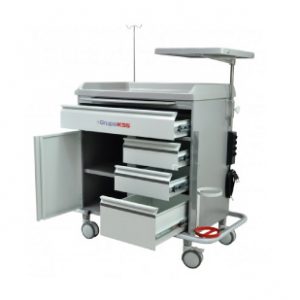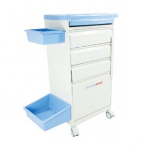 É dotado de 05 gavetas com guias deslizantes sendo 02 delas com colméias (divisórias para medicamentos), possui dispositivo para colocação de lacre, com fechamento total de todas as gavetas , tampo superior em fiberglass dividido em duas partes, sendo tampo principal e bandeja auxiliar com deslizamento lateral por corrediças para manipulação de medicamentos. Móvel confeccionado em chapa aço com acabamento em pintura eletrostática a pó, possui rodízios de 3″ sendo 02 deles c/ freio, o que facilita o transporte em todo o ambiente hospitalar.