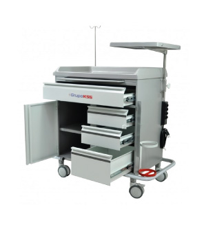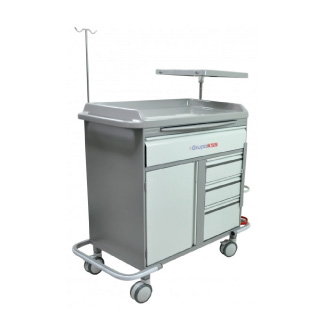Possui 04 gavetas todas com guias deslizantes, sendo que 02 delas com sistema de divisórias (22 ao total) tipo colmeia para acondicionamento de medicamentos. Possui ainda armário com prateleira para guarda do monitor/desfibrilador. Dotado de sistema de fechadura para as gavetas. O tampo superior é confeccionado em FIBERGLASS com pintura gel coat podendo ser confeccionado em diversos padrões de cores, possui anteparos laterais e de fundo contra impactos. Possui suporte para soro com regulagem de altura, mesa auxiliar.