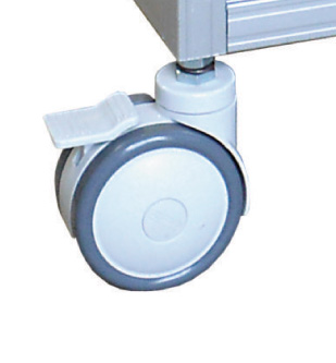 • Rodízios de 4’ (100mm) de diâmetro com garfo giratório em nylon poliamida natural. Duas rodas dotadas de freio total, cor padrão do freio vermelho.