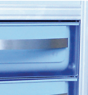• 6 Gavetas de 90mm de altura, em polímero ABS com nano tecnologia antibacteriana, sem emendas ou cantos vivos, com corrediças telescópicas, frente acrílico ou ABS com puxador de alumínio ou polímero.
